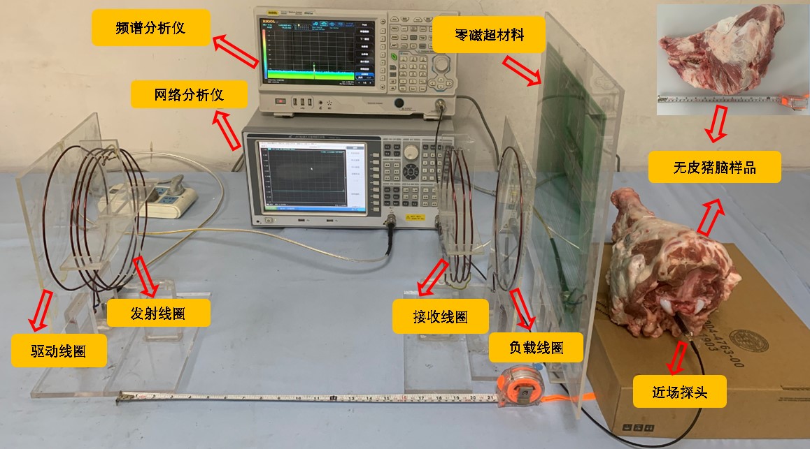为了模拟更加真实的环境,室温25℃的情况下在接收端放置无皮猪脑样品,实验装置如图2所示,近场探头插入猪脑样品里面来测量磁场强度。