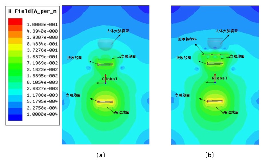 图1人脑模型电磁场分布:(a)未加载近零超材料,(b)加载近零超材料